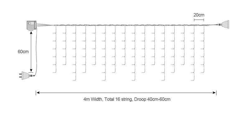 Drape your home in festive sparkle with this 5M-wide LED icicle curtain light, featuring 16 cascading drops (0.4-0.6m heights) of 96 energy-efficient LEDs for a stunning waterfall effect! Available in warm white, white, multicolor, or blue, it offers 8 dynamic modes—from chasing flashes to steady glow—for customizable holiday magic. Weatherproof PP/TPR construction with steel core ensures durability outdoors; easy plug-in setup (110V US or 220V EU) makes it ideal for eaves, weddings, patios, or garden parties.