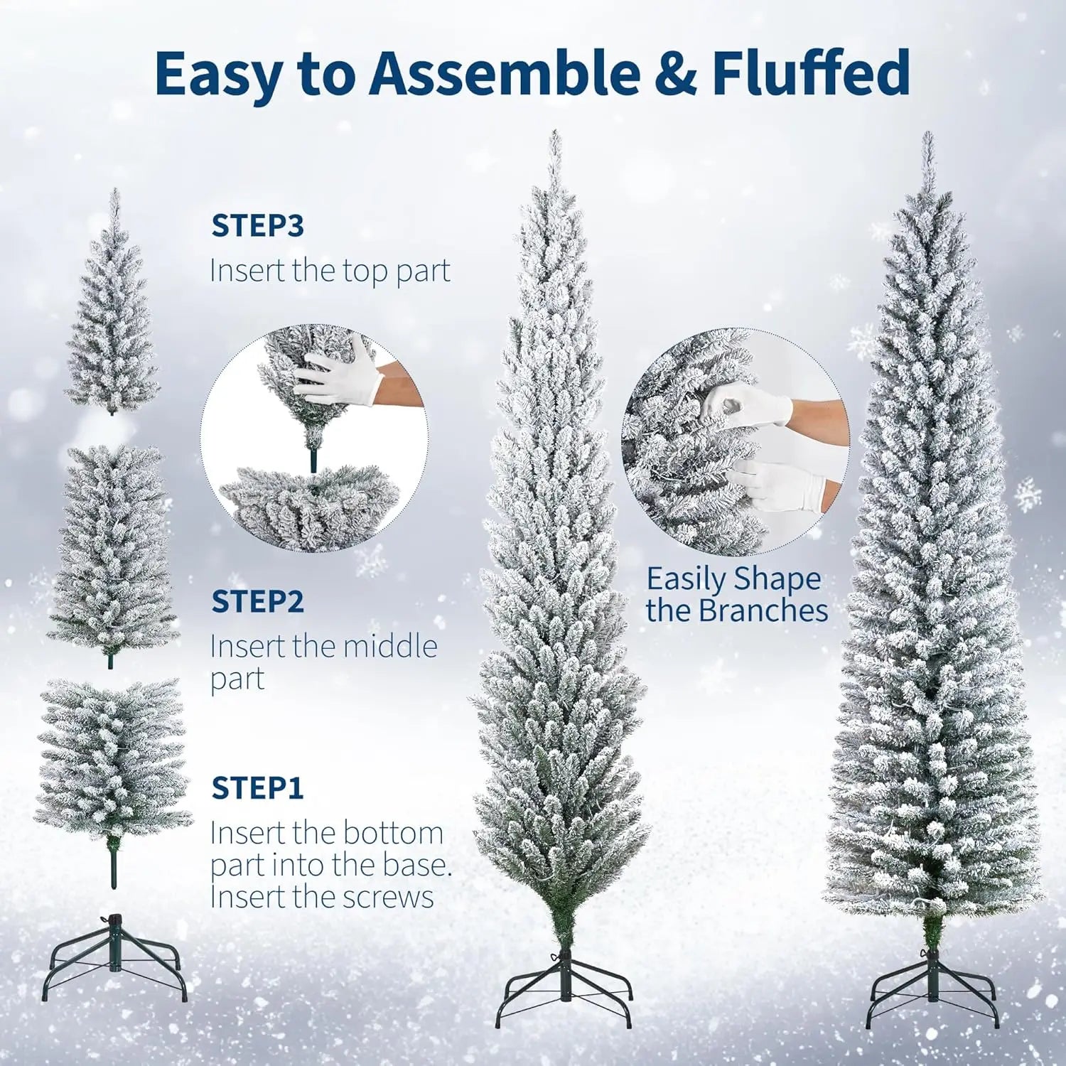 Slim 6/7.5/9FT Pre-Lit Snow Flocked Pencil Christmas Tree