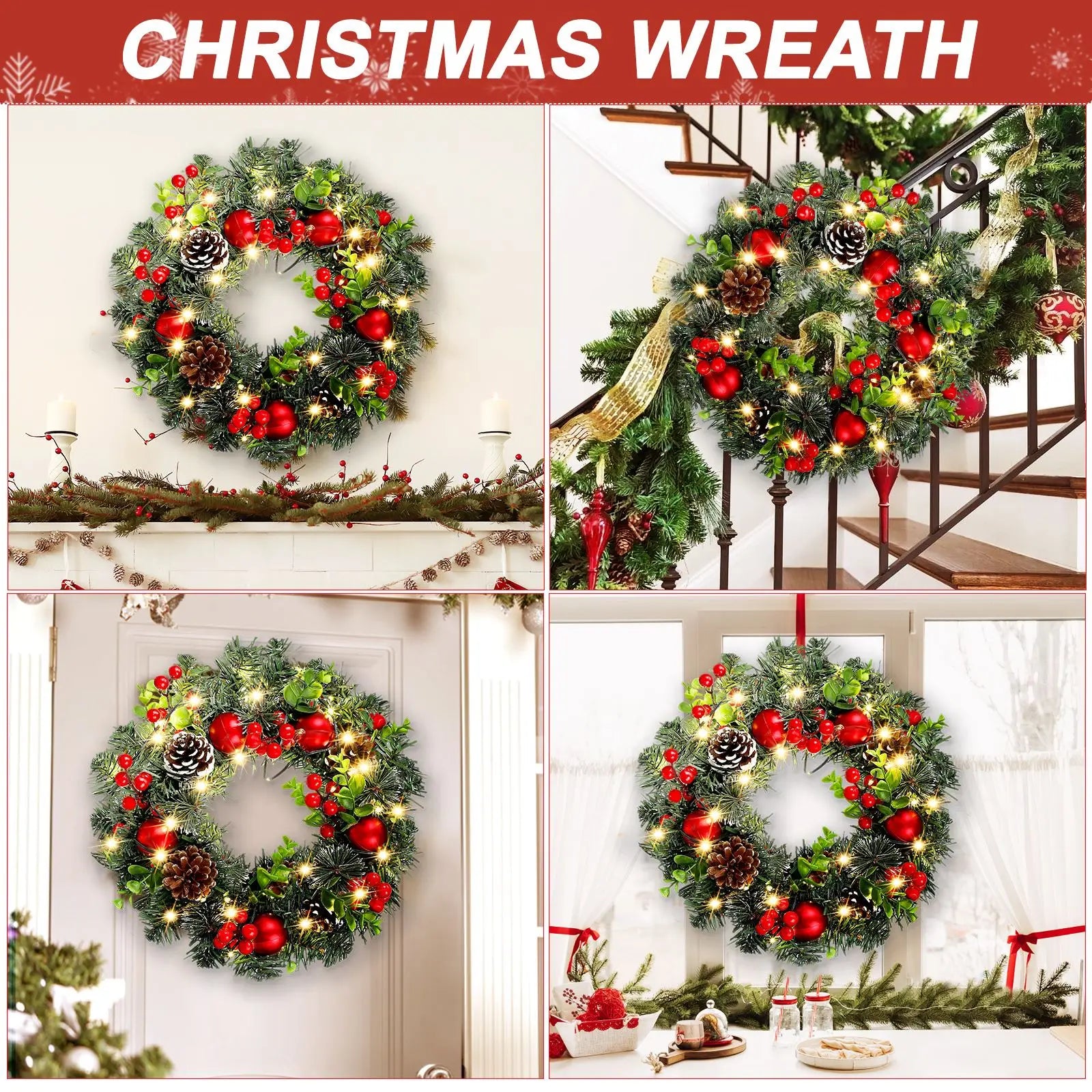 Bring magical holiday vibes to your front door or walls with this artificial Christmas wreath, featuring lush PVC/PE greens, vibrant red berries, and 20 twinkling LED light beads for a cozy glow. At 12" diameter, it's lightweight and easy to hang on doors, fireplaces, or trees—perfect for Xmas parties, family gatherings, or shop displays. Durable construction ensures long-lasting festive charm, creating warm welcomes and memorable atmospheres.